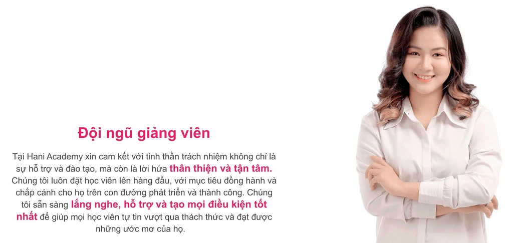- Đội ngũ giảng viên chất lượng: Các giảng viên tại Hani Academy đều là những chuyên gia có nhiều năm kinh nghiệm trong ngành nail. Họ không chỉ truyền đạt kiến thức mà còn chia sẻ những bí quyết, kinh nghiệm thực tế giúp học viên nắm vững kỹ năng nhanh chóng.