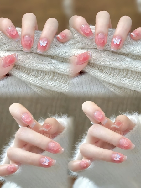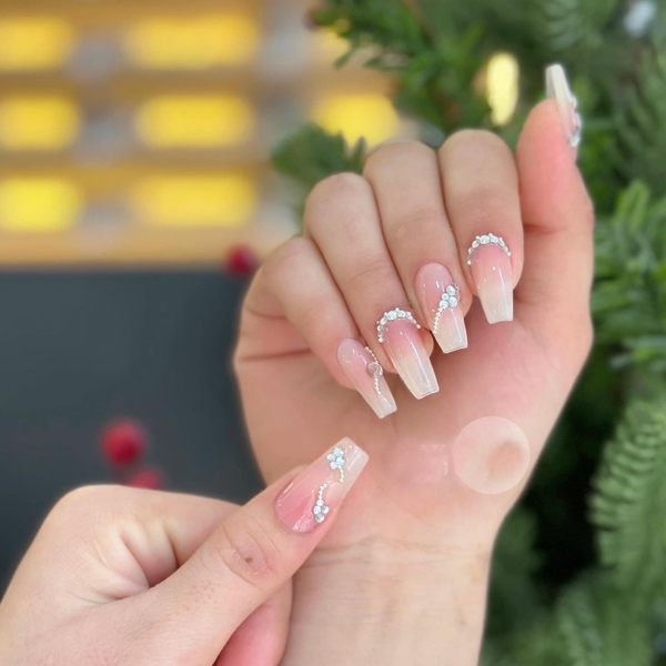 Hiệu ứng ombre chuyển màu từ hồng nhạt sang trắng kết hợp đá ánh kim mang lại cảm giác vừa hiện đại, vừa mềm mại.