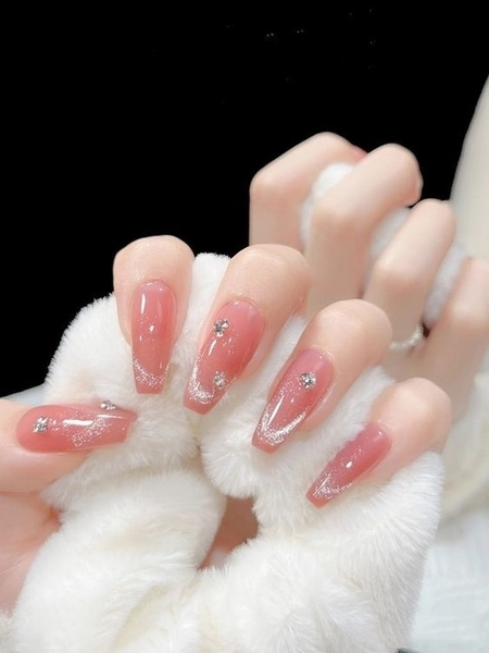 Màu hồng thạch nhẹ nhàng kết hợp cùng những viên đá lấp lánh tạo nên một mẫu nail vừa nữ tính, vừa sang trọng. Đặc biệt, kiểu nail này rất dễ phối hợp với trang phục và phụ kiện, giúp bạn nổi bật trong mọi hoàn cảnh.